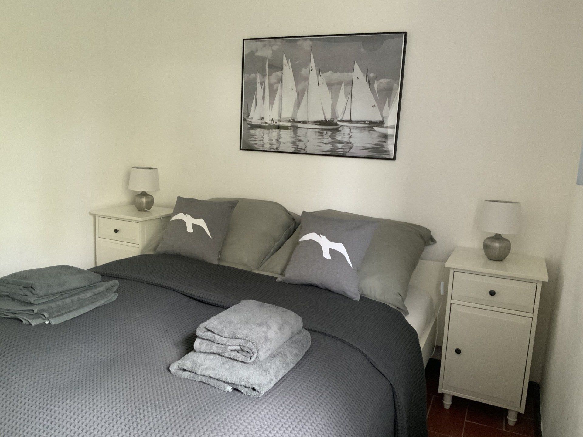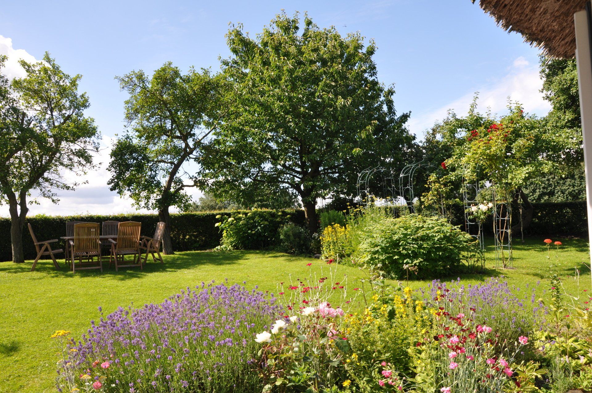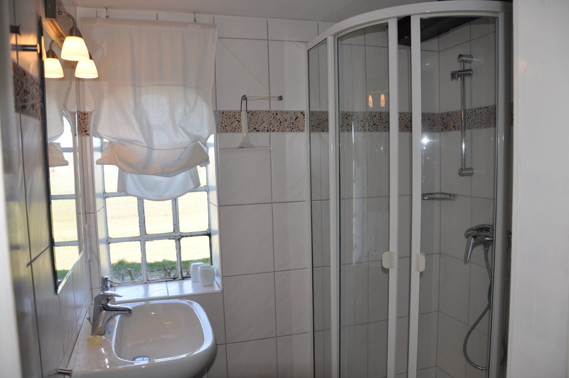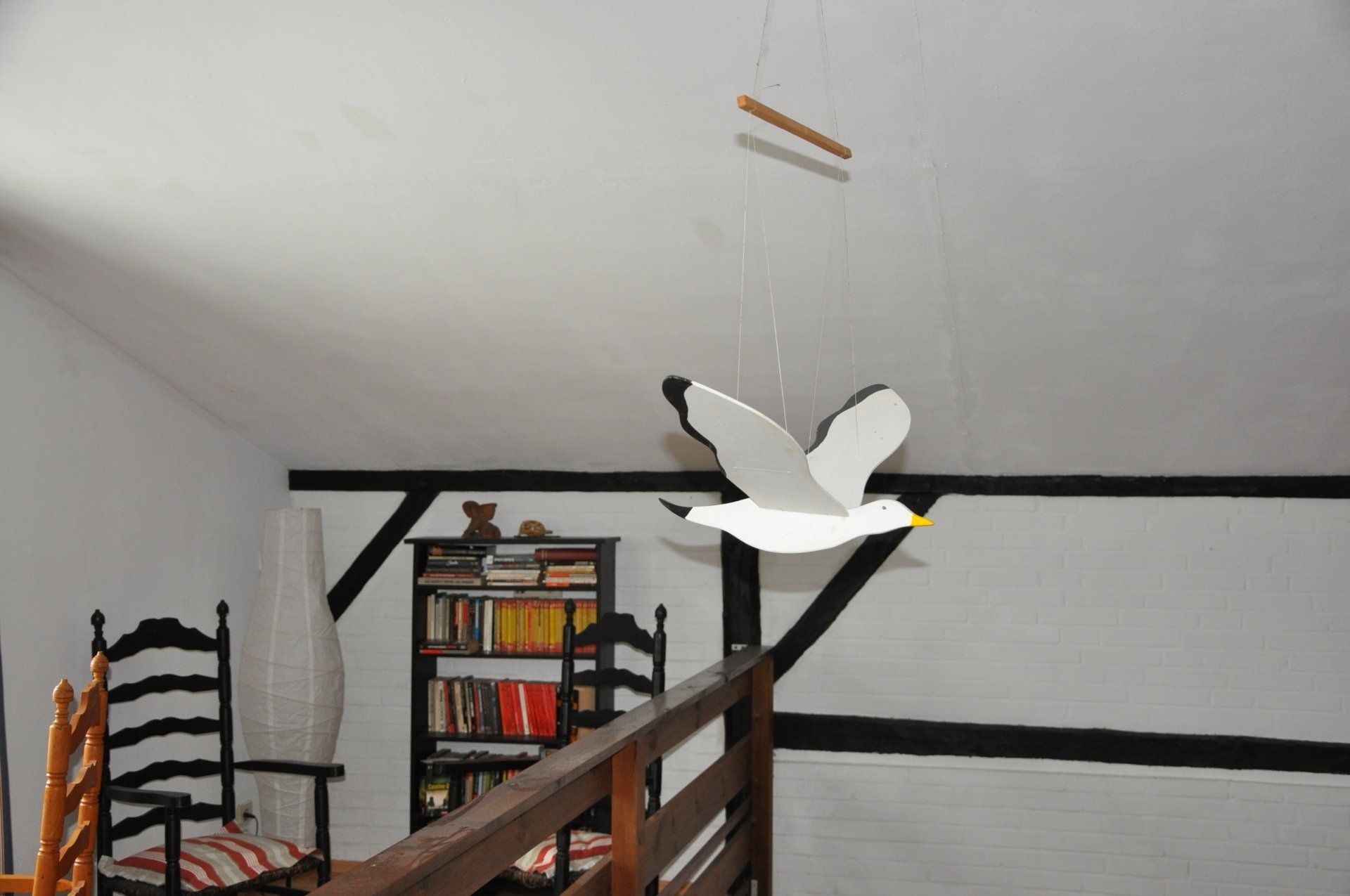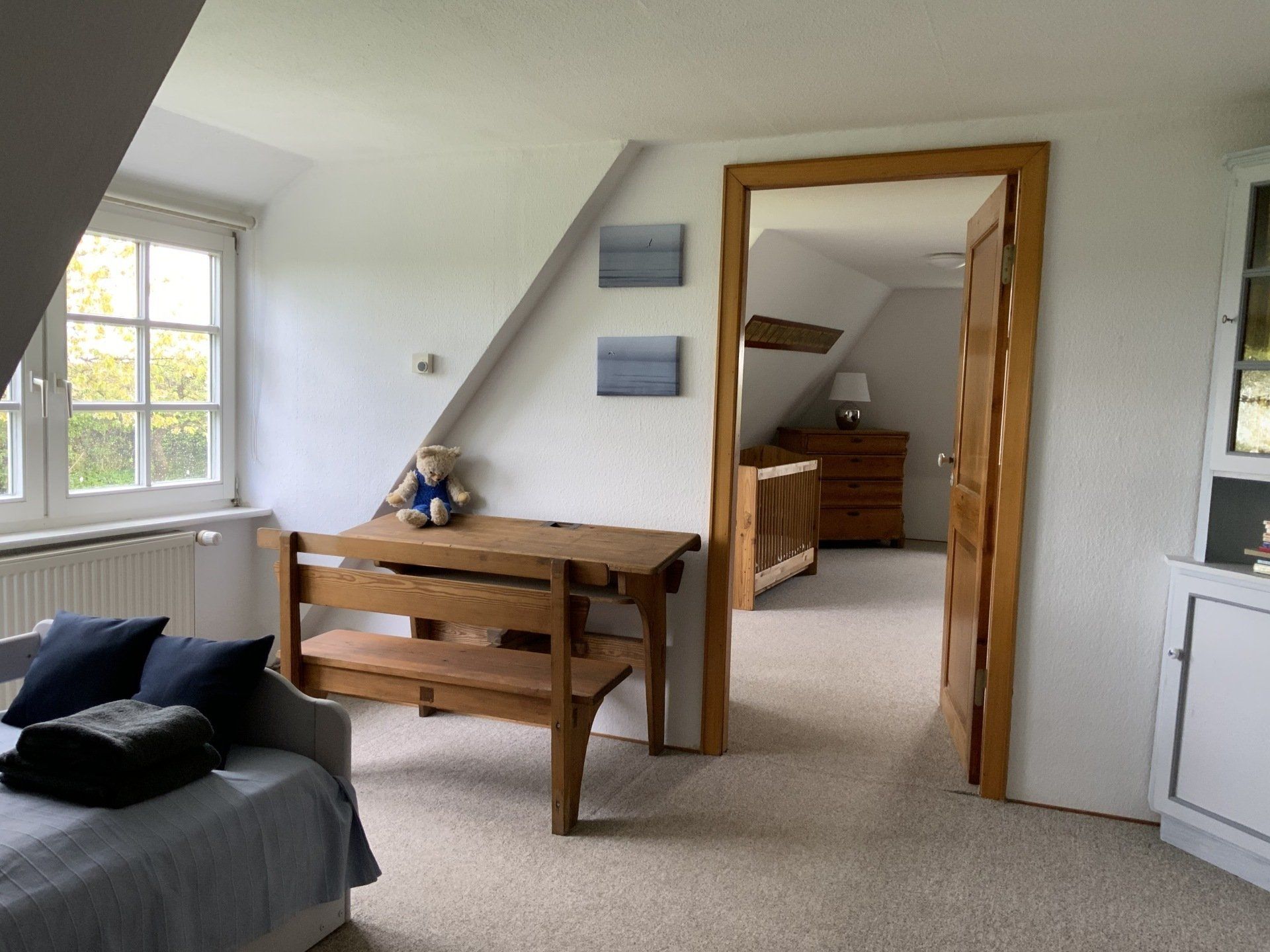 The apartment "Tenne" has a spacious 135 sqm and 4 bedrooms that can accommodate up to 7 people. The heart of the apartment is the cozy dining hall with a large oak table and a fireplace. On the ground floor there are two bedrooms, the kitchen, a shower room and a separate toilet. The upper floor impresses with its all-round wooden gallery with a cozy sofa corner, bean bags, a TV area (flat screen incl. DVD / blu-ray) and a reading corner. From the windows of the gallery you can see fields, grasslands, the Falshöft lighthouse and the Baltic Sea. From the gallery you can reach two additional bedrooms which are connected. The house is furnished in a typical Northern German country house style with high quality furniture.
